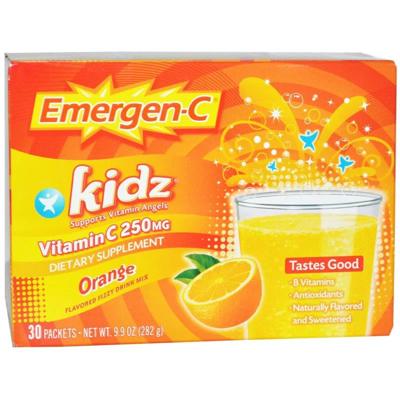 Emergen-C Kidz vitamin supplement drink mixes offer all of the fun and fizzy goodness of the original Emergen-C, now specially formulated just for kids! Plus each packet provides a whopping 250 mg of vitamin C, antioxidants, B vitamins, and electrolytes to keep your kids feeling good every day.Â