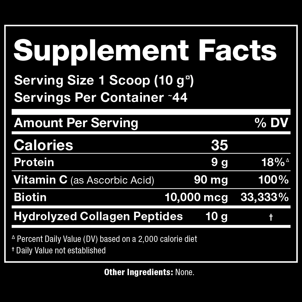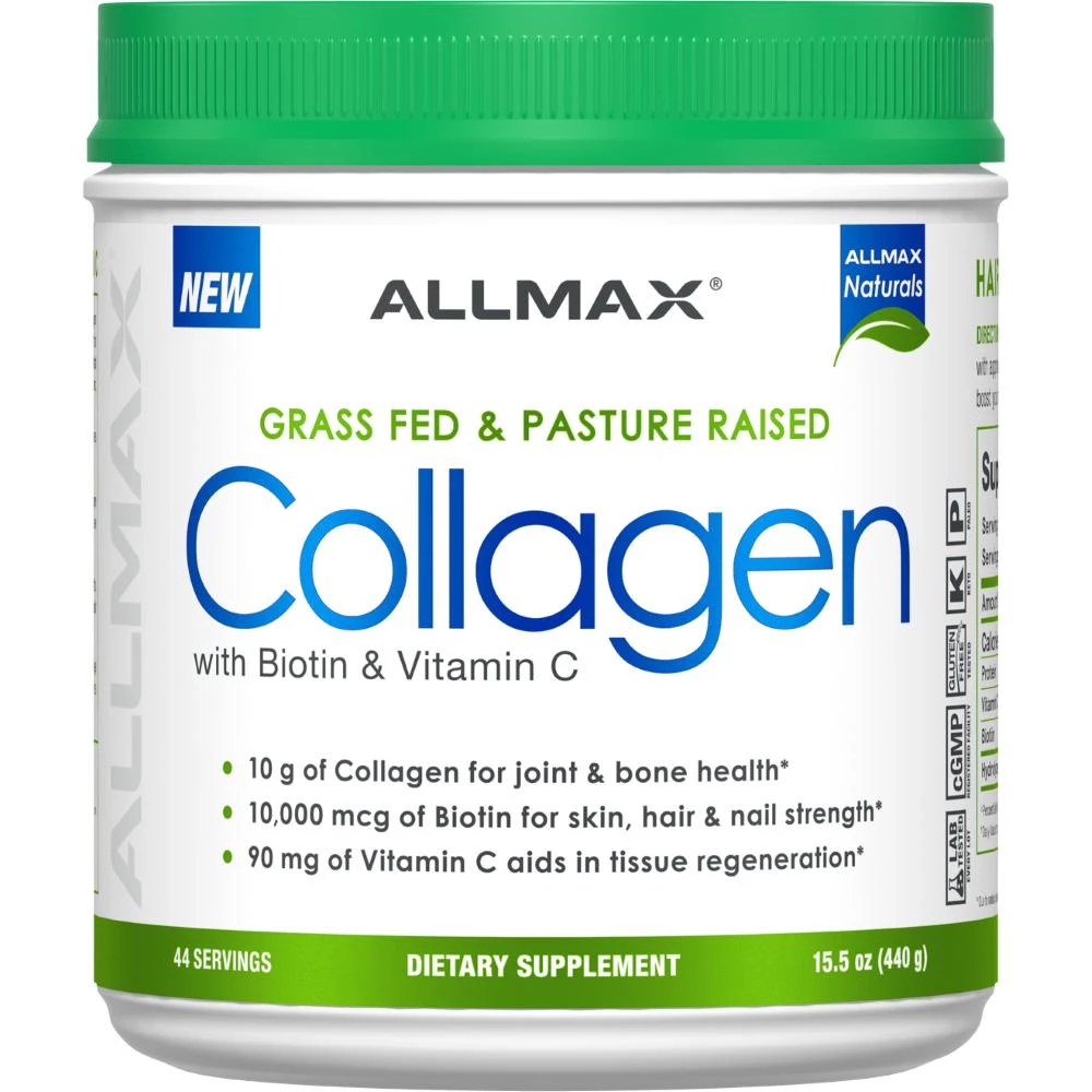 The ALLMAX Naturals line introduces all-new Grass-Fed and Pasture-Raised Collagen Powder with added Biotin and Vitamin C. Our Collagen Protein is derived from Hydrolyzed Collagen Protein Peptides, giving you 9 g of protein in every scoop. Collagen is essential for the production of connective tissue and provides support for healthy joints, hair, nails, and skin. What makes ALLMAX Naturals Collagen so special is the added benefits of Vitamin C that aids in the synthesis of Collagen along with Biotin for extra support in the formation of healthy hair, nails and skin.