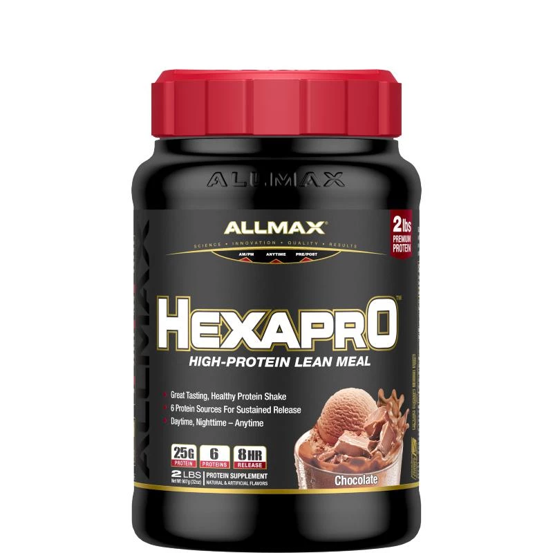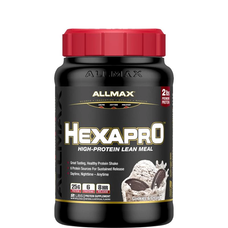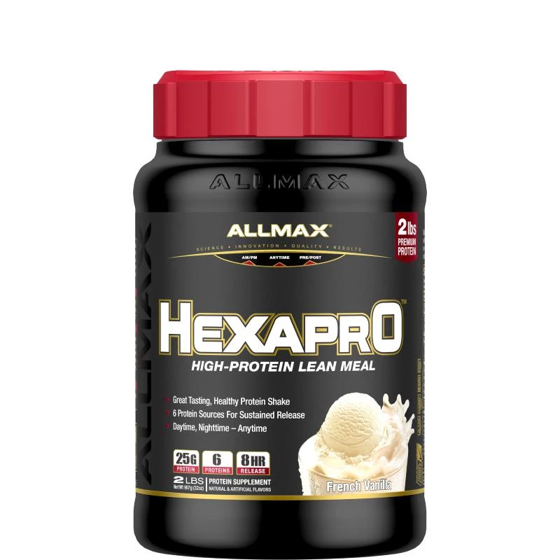 Allmax Nutrition HexaPro 2lb a unique blend of 6 different proteins together in a variety of great flavors. 25 g of protein. Sustained release over 8 hours. Over 17g of amino acids per scoop. Easily absorbed and digested. HEXAPRO has 6 highly-bioavailable proteins; fast, medium, and sustained-release. Combined, they ensure that protein delivery takes place across a much wider time frame than whey protein alone