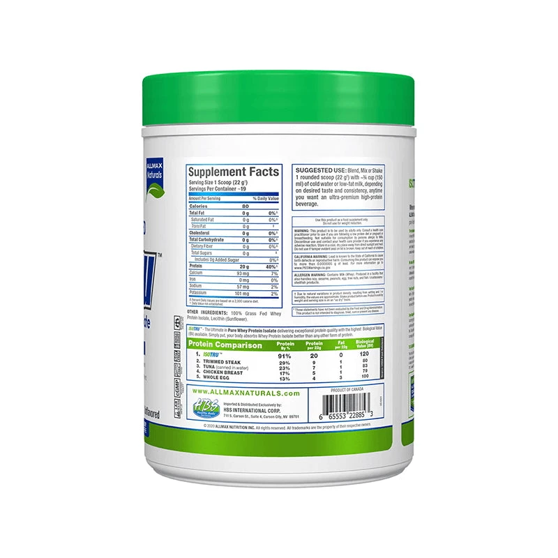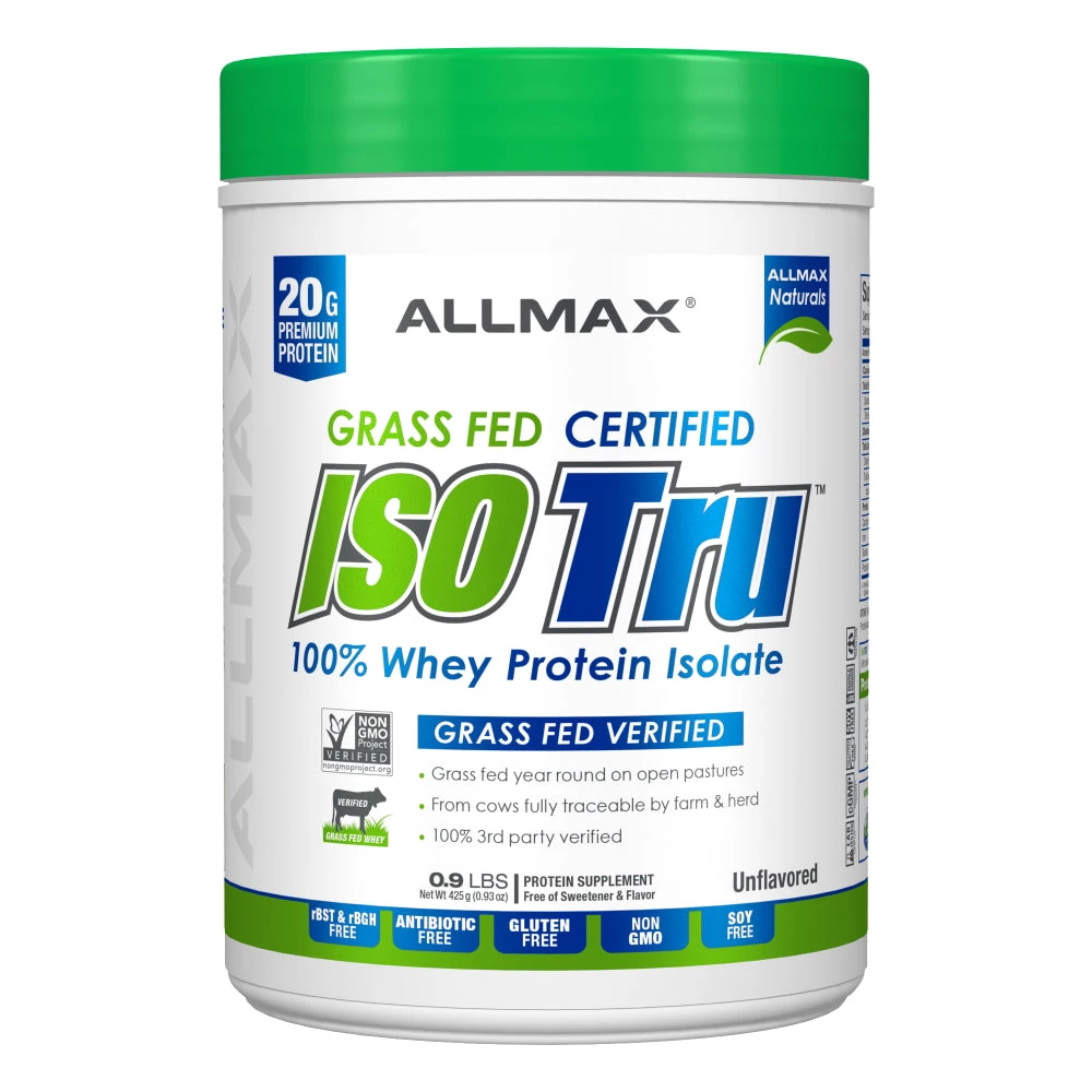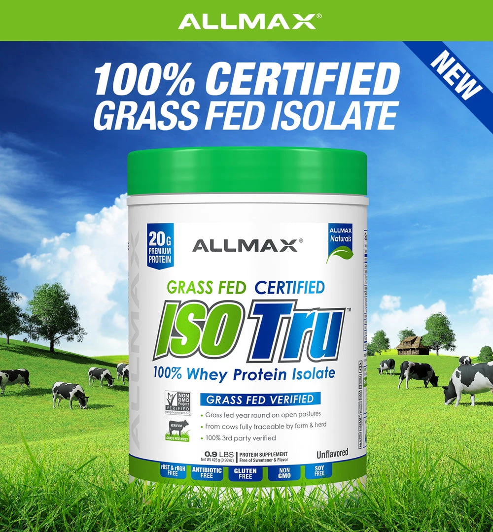 True Isolate protein from Allmax Nutrition. IsoTru is a 100% certified Grass Fed Whey Protein Isolate. It is sourced from 100% grass-fed cows, that are also antibiotic-free, rBST & rBGH free. It is Non-GMO, and Soy-free as well. A TRU-ly clean whey protein isolate.100% Certified Grass Fed Isolate! When grass-fed is important to you, make sure it’s Certified & Verified Grass-Fed. ALLMAX NATURALS ISOTRU is a nutritionally superior whey protein isolate with 20g of protein per scoop