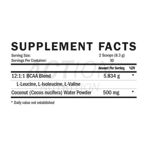 BCAA Loaded will help keep you hydrated, each serving of BCAA Loaded from Action Nutrition is stacked with 500 replenishing milligrams of coconut water powder to keep you going. Great to drink any time but especially during or after an intense workout to enhance recovery. A great and delicious BCAA that will help with muscle recovery and hydration. 30 servings of the muscle sparing, lean mass building amino acids you need to fuel your most strenuous workouts