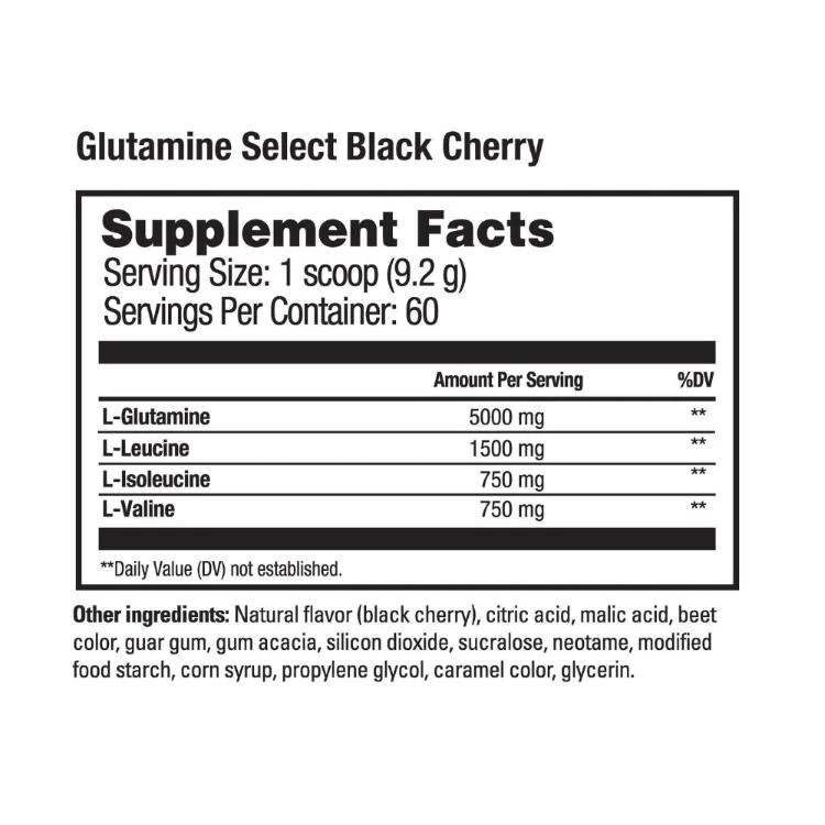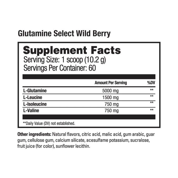 What: GLUTAMINE SELECT is a powdered drink mix consisting of the amino acids glutamine, leucine, isoleucine and valine. The latter three comprise the branched-chain amino acids (BCAA).