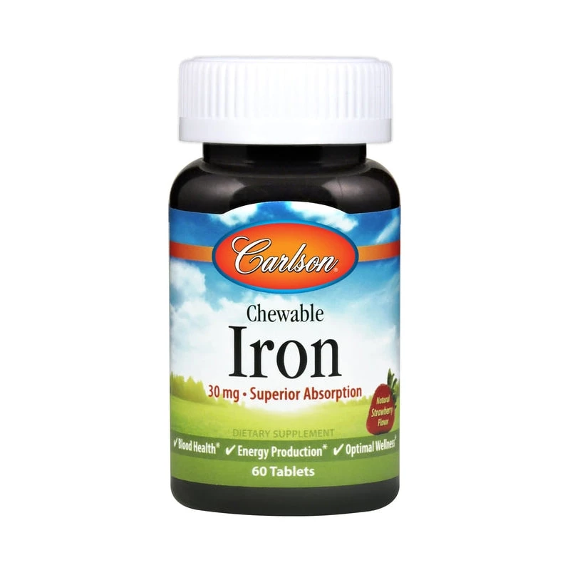​Iron is an essential mineral and an important component of hemoglobin, a substance in red blood cells that carries oxygen from our lungs to the rest of our body. Hemoglobin uses about two-thirds of our body’s total iron. If we’re lacking iron, our body can’t produce enough red blood cells, which can affect our oxygen level and make us feel tired. Every serving of Chewable Iron in delicious strawberry flavor provides 30 mg of iron to promote healthy blood, energy utilization, and immune function. Carlson Labs Chewable Iron 30mg 60T in a strawberry flavor to promote healthy blood, energy utilization, and immune function.