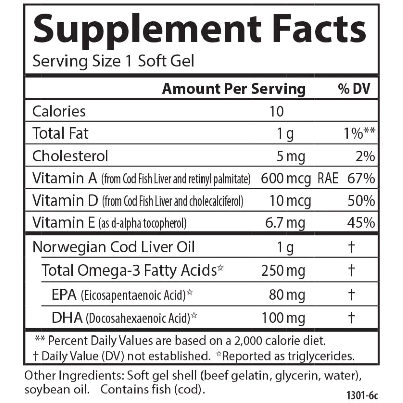 Ingredients:Â Vitamin A (from Cod Fish Liver and retinyl palmitate), Vitamin D (from Cod Fish Liver and cholecalciferol), Vitamin E (as natural d-alpha-tocopherol), Norwegian Cod Liver Oil, EPA (Eicosapentaenoic Acid), DHA (Docosahexaenoic Acid)