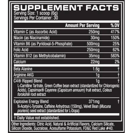 C4 Ripped contains a similar energy blend as the classic C4, with key ingredients for energy to help you push through your toughest workouts.*Â