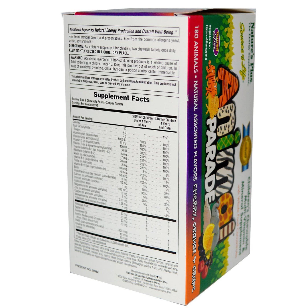 Each chewable tablet supplies 16 vitamins and 8 minerals, as well as nature’s most healthful whole foods, including spirulina, carrot, broccoli, whole brown rice, and spinach. Combining the natural goodness of whole foods with a balanced profile of nutrients is what makes Animal Parade a complete dietary supplement formulated for your child.
