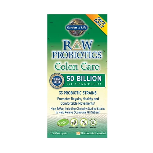 Garden of Life® Raw Probiotics Colon Care promotes regular, healthy and comfortable movements.†Maintaining a healthy balance of beneficial bacteria in the colon promotes a properly functioning digestive system and overall wellbeing. Each high-potency Raw Probiotics formula contains a naturally diverse group of over 30 beneficial probiotics strains from Bulgarian yogurt and Eastern European wild kefir. Raw Probiotics Colon Care is a high-potency, Raw, whole food probiotic formula containing a proprietary Colon Care Blend featuring probiotic strains clinically studied to promote healthy, comfortable colon transit time, elimination, and to support the immune system.