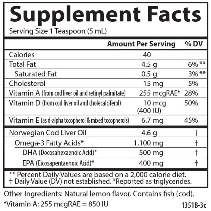 Carlson Labs Cod Liver Oil Liquid 500ml is a superb option to add to your diet. It is filled with vitamins and nutrients your body needs to have you feeling your best. Potency and purity guaranteed. Daily supplement to support cardiovascular function, cognitive health, and joints. 1 teaspoon a day.Â
