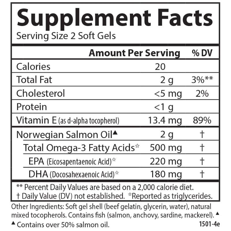 ​Each serving of Carlson Salmon Oil provides 500 mg of omega-3s, including EPA and DHA. To ensure maximum freshness, Salmon Oil is closely managed from sea to store. And like all Carlson omega-3s, freshness, potency, and purity are guaranteed.