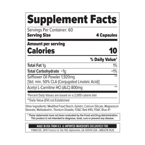 ALC+CLA™ combines two of the most effective stimulant-free weight loss ingredients into one complete product. FINAFLEX® ALC/CLA™ is the only product on the market that combines Acetyl-L-Carnitine (ALC) with Conjugated Linoleic Acid (CLA), creating a uniquely effective weight management powerhouse without stimulants. ALC/CLA™ promotes healthy body composition by reducing body fat, increasing lean muscle mass, and supporting cellular energy by enabling cells to oxidize fat and turn it into energy.* Use ALC/CLA™ daily to help support a healthy lifestyle.