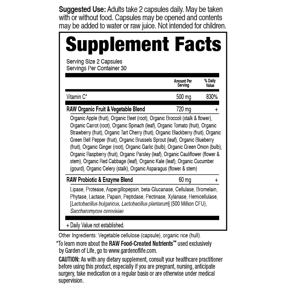 RAW whole food vitamin C (500mg) with bioflavonoids, blended in a base of 23 fruits and vegetables with live probiotics and enzymes.
