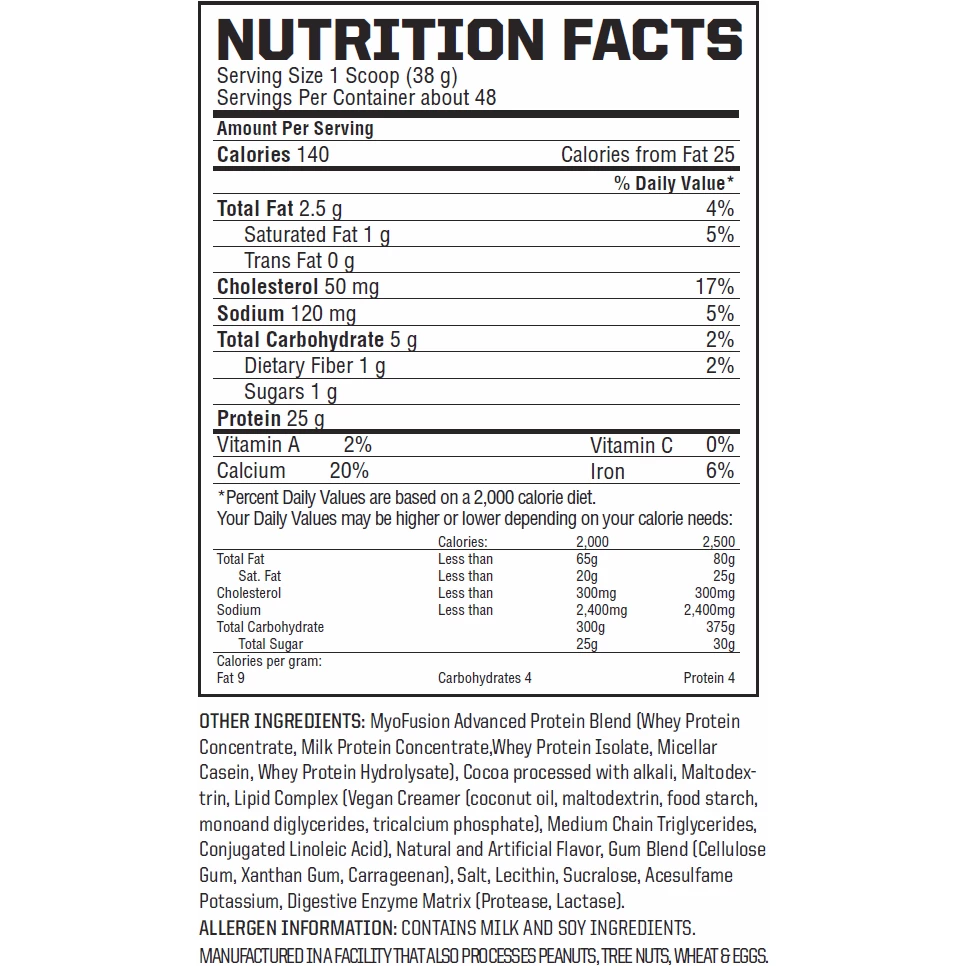 The ADVANCED formula is the ultimate time-released blend featuring fast acting whey hydrolysate, ultra pure whey isolate, high-grade whey concentrate, slow digesting micellar casein and complete milk protein. Every scoop is packed with 25g of clean muscle building protein with no added sugar, no synthetic colors, no corn syrup solids, no amino infusions and its gluten-free.
