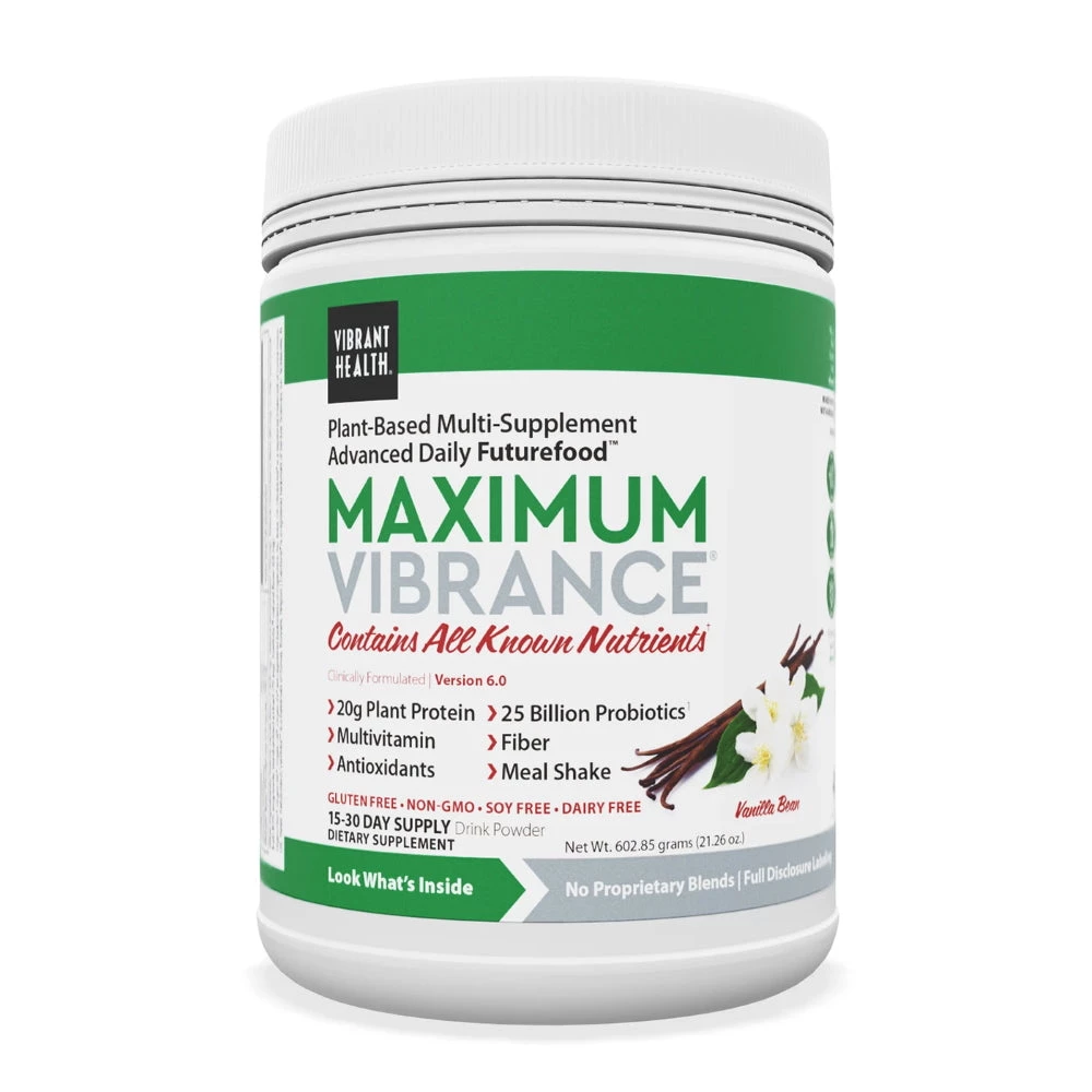 Maximum Vibrance from Vibrant Health is an all-in-one multi-supplement. The 15-30 day supply is clinically formulated and is gluten-free and soy-free. Maximum Vibrance contains all the benefits of a green superfood plus high antioxidant fruits and vegetables, a meal’s worth of plant protein, and an organic, plant-based multivitamin. Multivitamin, green food, and antioxidant supplement 20 grams of protein per serving 25 billion probiotics per serving. Maximum Vibrance combines fully balanced vegetable protein to certified organic vitamins and minerals of plant origin and then blends them into a mass of specially selected and certified organic plant foods that provide a complete array of nutrients necessary for optimal health. Get all the nutrition you need in one meal with Maximum Vibrance