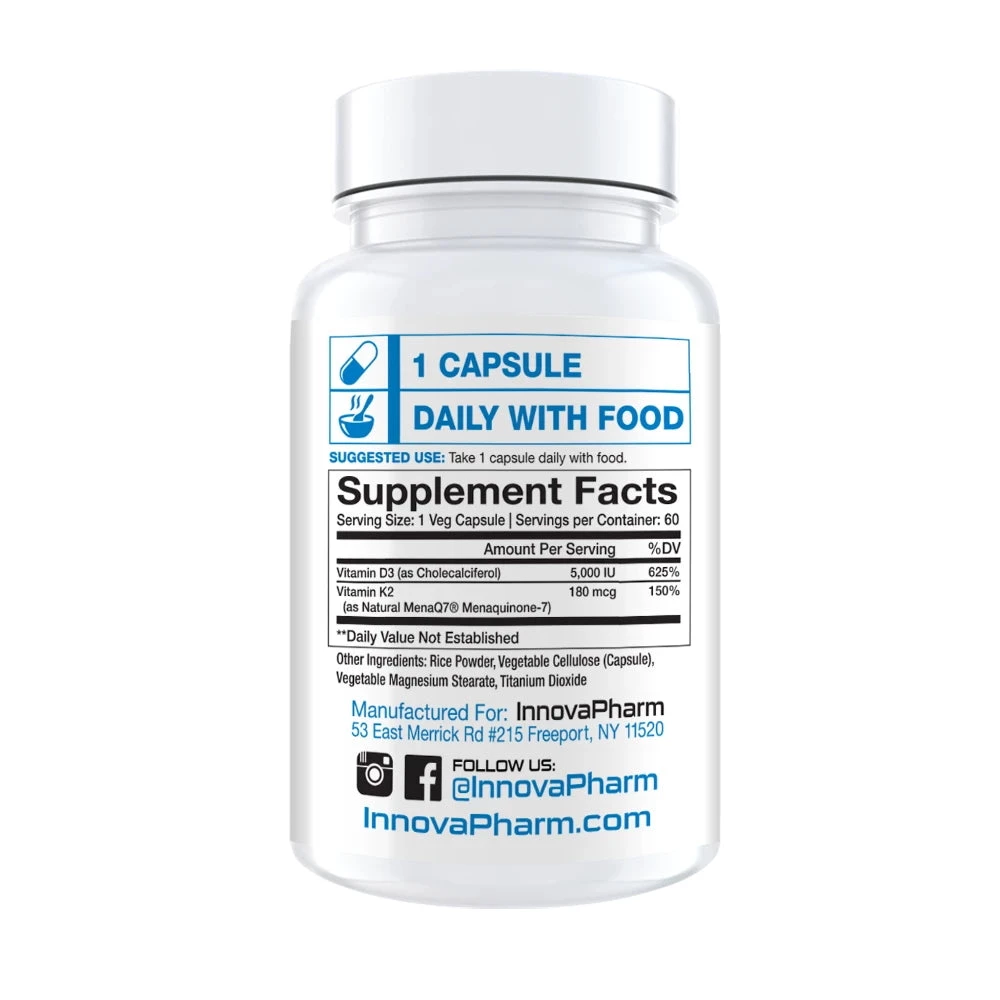 InnovaPharm Essentials™ D3+K2 combines vitamins D3 and a patented, highly bioavailable form of vitamin K2 known as MenaQ7®. These two vitamins have been researched extensively for their importance in the health of bones, teeth and the cardiovascular system.*