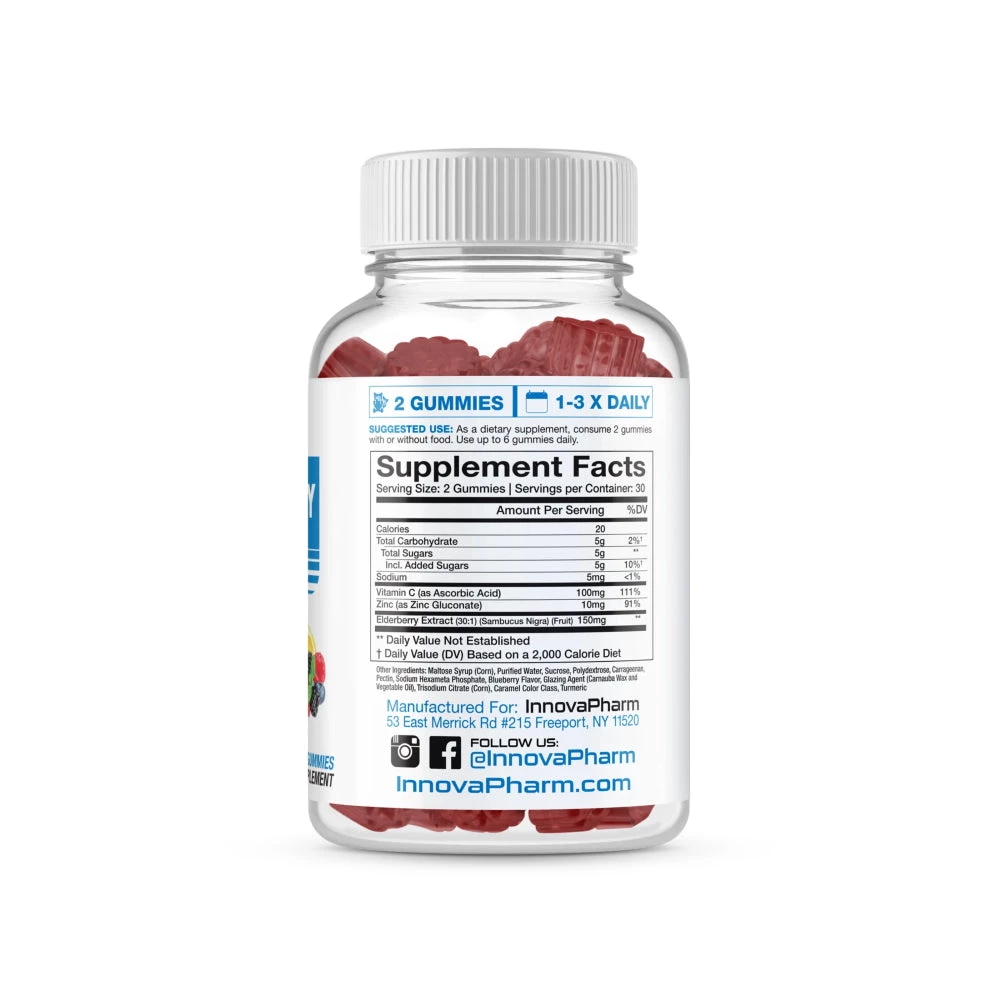 InnovaPharm Essentials Elderberry Immunity Gummies 60ct Encourages immune health for all-season defense, great-tasting, and convenient gummy form. Contains Zinc and Vitamin C, two crucial nutrients known to support immunity, creating a triple-action immune blend of unparalleled quality and potency!