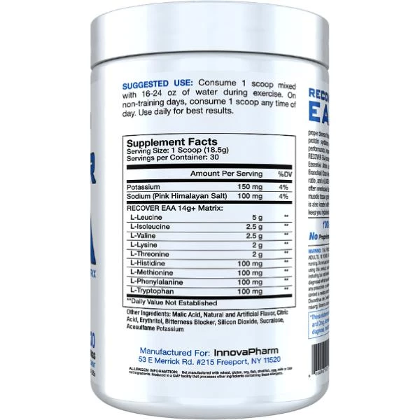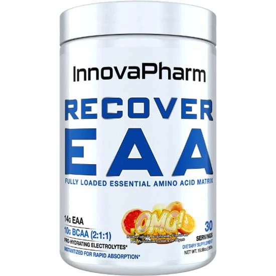 InnovaPharm Recover EAA 30 Servings contains all the essential amino acids your body needs for recovery. High dose of BCAA’s and High dose of the most important EAA’s for recovery, immune function, central nervous system support, and lean muscle tissue. Refuel, repair, recover, muscle recovery, and electrolytes. Optimized performance and superior hydration. Contains All 9 EAA’s