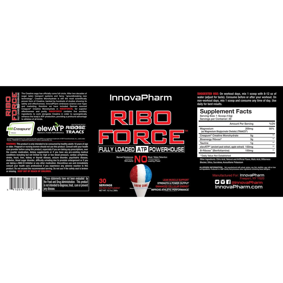 InnovaPharm Ribo Force 30 Servings is a complete ATP product. Most people think of ATP and automatically default to creatine – and they’re not wrong, but creatine is not the only option for ATP. Innova Pharm hits it from all angles with Ribo Force through creatine, D- Ribose, B-Ribose, and ElevATP. This product will aid in recovery and increase performance in strength and power while helping support lean muscle growth. Take a full serving of Ribo Force before each workout. On off days take it around the same time. 1 serving is enough.