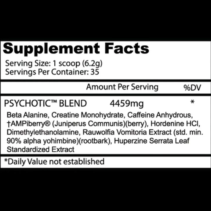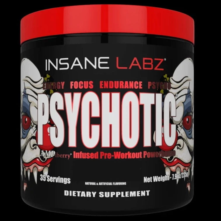 ENERGY. FOCUS. ENDURANCE. STRENGTH. If having a substantial energy and strength boost that keeps going long after your workout has ended, Insane Labz PSYCHOTIC is the only choice. Loaded with Beta-Alanine, Creatine Monohydrate, Hordenine HCI, and DMAE to boost endurance and focus to get you through the toughest workouts.