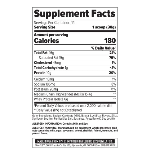 FINAFLEX® 100% KETO™ FOOD is a Ketogenic Meal Replacement Shake built on the commonly accepted Ketogenic ratio of 75% Fat, 20% Protein, and 5% Carbohydrates. Are you on Keto but struggle to find food options that fit your dieting needs? 100% KETO™ FOOD was built with the Ketogenic Dieter in mind, creating a perfect Keto meal that can be used anytime during the day to promote and maintain Ketosis. Featuring a formula packed with MCT Powder and Whey Protein Isolate create full-bodied and delicious Keto Milkshake every time!