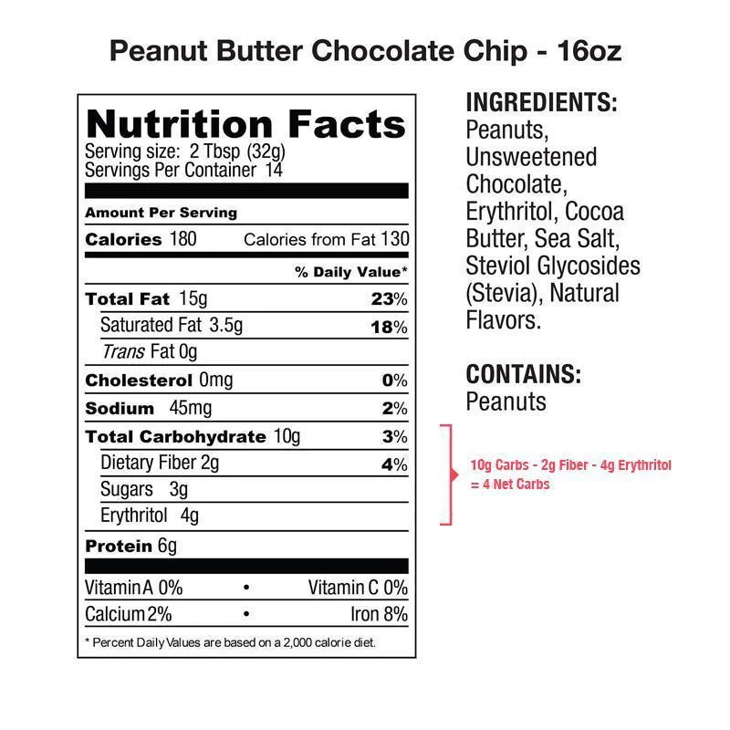 Our Peanut Butter Chocolate Chip Nut Butter is made with creamy, all natural peanut butter and sugar free chocolate chips. It is low in carbs, with no added sugars or sweeteners, so there is no need to feel guilty. Eat straight from the jar or spread onto your favorite protein pancakes.