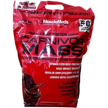 Beef Protein Isolate: Beef has proven itself as an anabolic protein over centuries of use. Now MuscleMeds is the first to provide bodybuilders with a beef protein isolated from its proprietary matrix, thereby giving it the freedom to spike blood amino acid and insulin levels at speeds comparable with whey resulting in comparable or even higher impact anabolic effects. MuscleMeds beef protein isolate (BPI) is 350% more concentrated in amino acids than steak and more concentrated than whey, with no fat or cholesterol. Plus its further enhanced with 5 grams of creatine and additional BCAAs for even greater anabolic power. With Carnivore Mass, you get the mass building benefits of beef protein at the speed of whey without the lactose, allergies and other problems frequently associated with the use of dairy products.