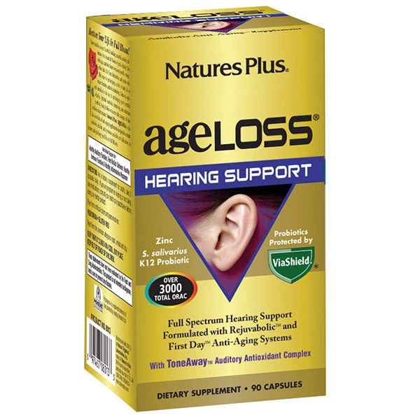 Nature’s Plus AgeLoss Hearing Support is the first-ever dietary supplement to supply precision antioxidants that neutralize the free radicals responsible for age-related hearing problems. AgeLoss Hearing Support helps rejuvenate youthful auditory health. AgeLoss Hearing Support includes: