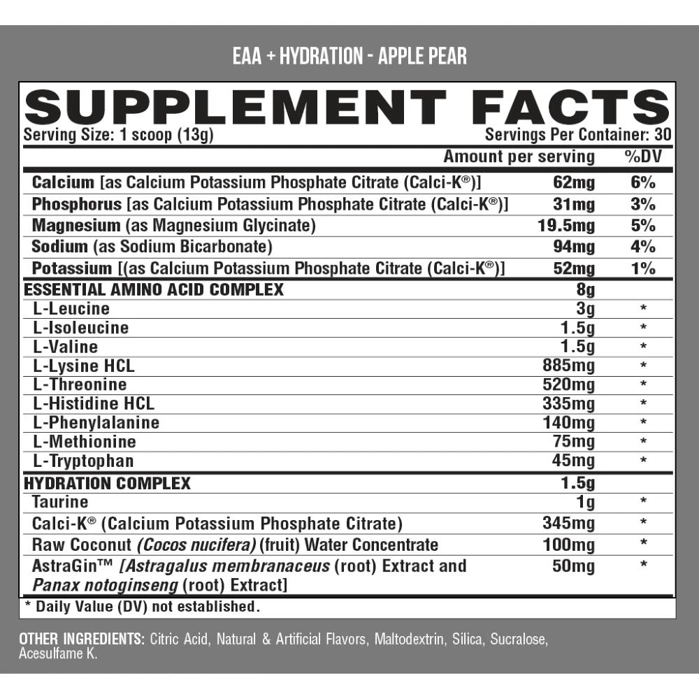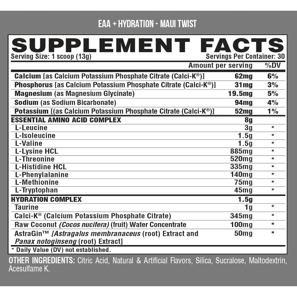 In essence, EAA +HYDRATION is a comprehensive EAA, BCAA and hydration formula that helps to keep workout intensity high even under the toughest conditions. EAA +HYDRATION is ideal for consumption pre, during and after workouts or at any time during the day when you need to refuel on critical amino acids and electrolytes. All ingredients and amounts are fully disclosed on the label, so you know exactly what you are getting. Finally, EAA +HYDRATION is also setting a new taste standard among amino acids. This product delivers an incredible burst of exotic fruit flavors so delicious you will want to sip on it all day long!Ɨ