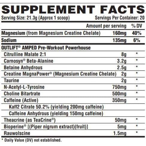 With the addition of new energy and focus promoting ingredients such as TeaCrine®, Kaff2, Rauwolscine and Choline Bitartrate, as well as new performance enhancing compounds like Betaine Anhydrous and Creatine MagnaPower®, OUTLIFT® AMPED definitely takes the top selling original OUTLIFT® for a wild, AMPED up ride!