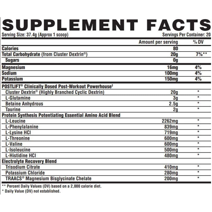 Nutrex PostLift 20 Servings. The perfect post lift drink to keep you hydrated and provide you with all the essential amino acids and carbohydrates needed to promote muscle synthesis