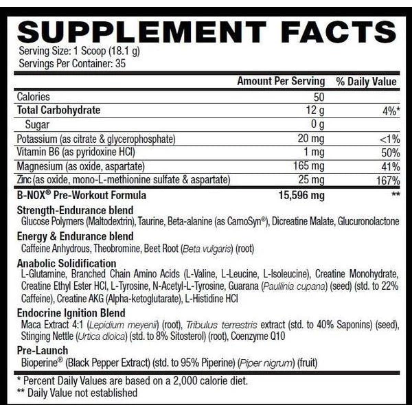 B-NOXâ„¢ is the first pre-workout nitric oxide to offer a testosterone boosting blend promoted to enhance aggression and the pump during exercise.* For energy, B-NOXâ„¢ combines N-Acetyl Tyrosine, Glucuronolactone, Caffeine Anhydrous, and Theobromine for the ultimate, sustained energy rush with less chance of ‘crash’ or ‘jitters.
