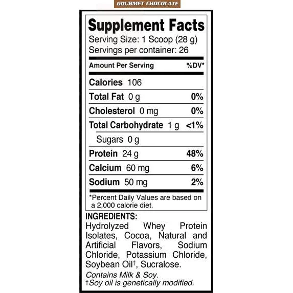 Hydrolyzed Whey Protein Isolate, Whey Protein Isolate, Cocoa Powder (Processed with Alkali), Salt, Soy Lecithin, Natural and Artificial Flavors, Potassium Chloride, Sucralose.