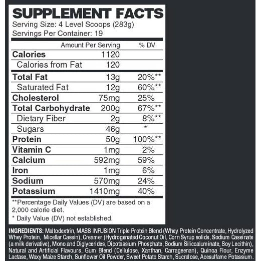 MASS INFUSION is an advanced weight gain formula supplying your body with 50 grams of high-quality protein per serving, over 1120 calories along with 200 grams of carbohydrates. Its nutrient dense formula is ideal for those athletes that are seeking to gain weight fast and become bigger and stronger. MASS INFUSION is packed with three different proteins. It is high in essential amino acids and with its naturally occurring high level of BCAAs, it helps fuel muscle growth and strength development.