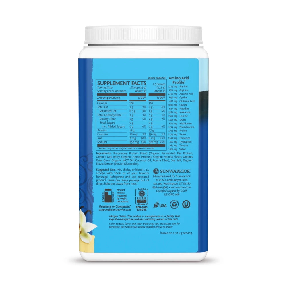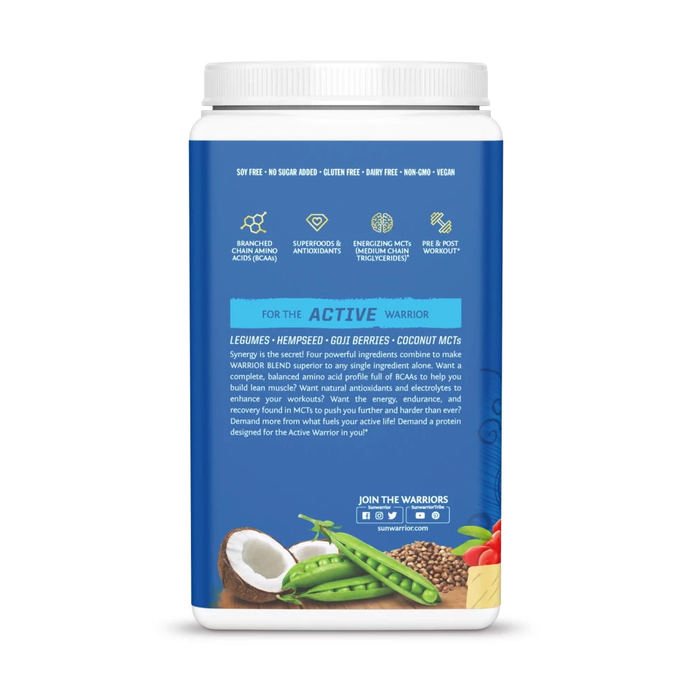 Warrior blend by Sunwarrior nutritional supplements brings you the perfect combination for a plant-based protein powder. With a mixture of pea protein, super antioxidants, goji berries, MCTs, legumes, hemp, and ground coconut.Â