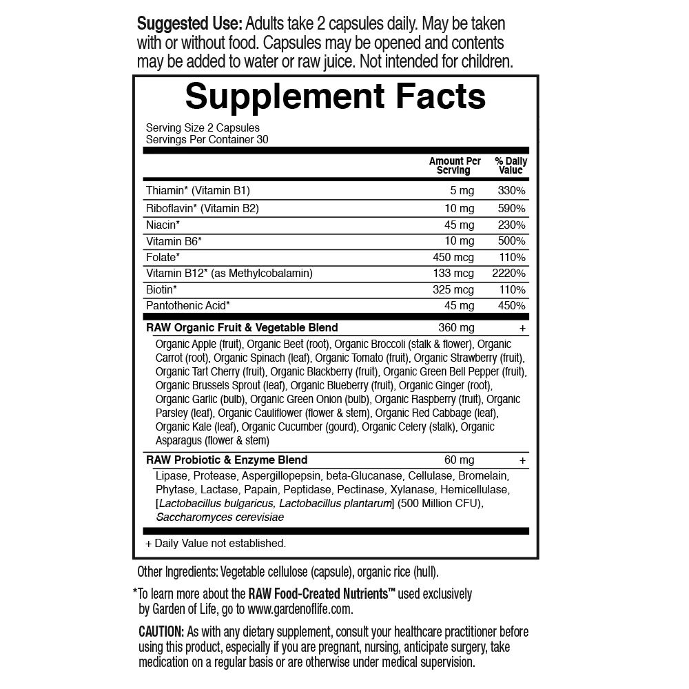 Vitamin Code RAW B-Complex—RAW whole food high-potency B-complex blended in a base of 23 fruits and vegetables with live probiotics and enzymes. Garden of Life Vitamin Code Raw-B Complex provides plenty of benefits by blending whole foods to give you vitamins and minerals your body needs.Our vitamin b complex provides mental and physical energy, supports blood health, heart health, immune system health and healthy stress response/