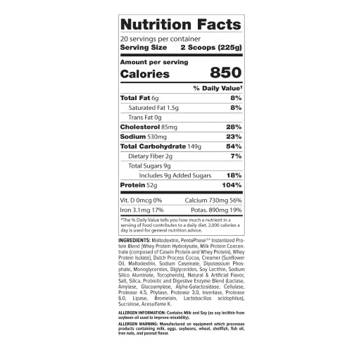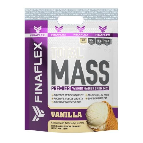FINAFLEX TOTAL MASS® s built with the highest quality protein available today, separating itself from other weight gainers that contain low-quality ingredients and high levels of saturated fat and sugar. TOTAL MASS is packed with 52g of PentaPhase Protein and 149g of carbs with just 9g of sugar per serving! In order to help ease digestion TOTAL MASS features an exclusive Probiotic and Digestive Enzyme Blend (PDE) that also increases macronutrient absorption, helping you pack on MASS.